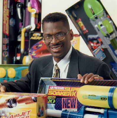 It should be noted that the original prototype was the size of a breadbox and was in no way manufacturable on a mass-scale. However, thanks also to the inventiveness of Bruce D'Andrade, the design for the original Super Soaker® was born (known as a pinch trigger pump water gun: U.S. Patent # 5,074,437). Both Bruce D'Andrade's and Lonnie Johnson's names appear on the patent. (Both Lonnie Johnson and Bruce D'Andrade are acknowledged on the box for the Collector's Edition Super Soaker 50). Unlike its motorized predacessors, the pinch trigger pump water gun relied on air pressure and arm pumping for pressurizing the firing chamber. The end result was a water blaster capable of delivering more water farther and faster than any other water gun on the market. The brand name, Super Soaker, was introduced nation-wide in 1991 through a series of TV-advertisements. Lonnie Johnson is also responsible for a lot of other developments, both toy and non-toy related. He is pictured above with some of the items which would simply not exist were it not for his visions. Bruce D'Andrade co-invented the Super Soaker® , working with Lonnie to take his prototype into the toy world. It was Bruce's mechanism and knowledge of the toy industry which made mass-production of such this blaster possible. It was also Bruce who continued working on developing the Super Soaker® series. Unfortunately, Bruce D'Andrade passed away in 1998, may he rest well. iSoaker.com owes a good part of its own existence to the success, reliability, and performance of the Super Soaker® series of water blasters. We would also like to thank Lonnie and Bruce for bringing the world the Super Soaker® , pushing the envelope with further design enhancements and developments. Water blaster technology has not stagnated in the hands of Larami Corp., makers of the Super Soaker®. In 1991, the SS 100 was released, offering the first of the Super Soakers(tm) to have a separate pressurized firing chamber. This allowed the user to refill the primary reservoir at any time since the primary reservoir did not need to be pressurized for the blaster to shoot. As well, the blaster required fewer pumps in order to build up enough pressure to fire. In 1992, Larami Ltd. toyed with varieties based on the pressurized reservoir and separate pressurized firing chamber models. One of the interesting variants which was released was known as the SS MDS (Multi-Directional Soaker) which featured a nozzle which could be point straight, directly left, directly right, and all angles in between. In 1993, the first XP-rated Super Soakers(tm) were released. XP (Xtra Power) Super Soakers(tm) used the same technology as the original series, but featured larger nozzles in order to deliver more water at a quicker rate. The XP-generation went through various design mutations culminating in the first two double-barrelled (XXP 175 and XXP 275) and the first triple-barrelled (XP 85) Super Soakers (tm). It was also this year that Larami Corp. was purchased by Hasbro Inc. and was renamed Larami Ltd. As the blasters continued to get larger and carry more water, there was no significant increase in output due to the limitations of the pressurized water system and safety concerns. However, in 1996, the CPS 2000 (Constant Pressure System) was unleashed, once again changing the face of the water war field. Unlike all its predacessors, the CPS 2000 employed a revolutionary firing chamber system which relied on the elastic properties of a rubber-like substance to pressurize the water (CPS U.S. Patent under Bruce D'Andrade, Patent # 6,193,107). The CPS-technology allowed even more water to be unleashed at a faster rate than the XP-series could. As well, unlike air-pressure-based blasters which tended to trickle as their pressure dropped during firing, CPS-based blasters suffered virtually no change in pressure due to the nature of the elastic chamber used. As such, virtually all water could be dispensed at top pressure and travel the complete firing range. However, the CPS system was not without its fault. Rumour has it that the CPS 2000 was removed from the market simply due to its sheer power. Anyone who has experienced a direct blast from a CPS 2000 can tell you that the stream packs more punch than most garden hoses. All future models based on the CPS systems appear to have been toned-down in order to meet some forms of safety criteria. Also, due to the nature of the firing chamber, several people have reported firing chamber ruptures during use, turning a power blaster into a dribbling mess. After prolonged use, it appears that the rubber in the firing chamber can lose its elasticity and break. Problems aside, the CPS-based blasters remain top of the power and range categories. However, firing chamber technology is not the only facet of the Super Soaker® which has evolved over the years. Reservoir and filling technology has also undergone many variations. The original Super Soakers(tm) used screw-on bottles with tubing which sat in the bottle to allow water to be drawn from the reservoir. However, this reservoir design had three major short-comings: the O-Rings where the bottle met the blaster tended to wear down quickly, especially if the reservoir needed to be pressurized for the blaster to shoot; the reservoir could usually not make full use of its contents has there was always some water remaining due to the design of the tubing; and the reservoir took a while to remove, fill, then reattach. From the original designs, Larami Ltd. seemed to have experimented for a while with half-twist and quarter-twist on reservoirs as seen on blasters such as the XP75, XP105, XP150. The angle of the bottle opening was altered such that water drained via gravity directly into the pump intake instead of needing to be draw in by a hose. However, these reservoirs had problems mainly due to the tab construction. The tabs which held the reservoir in place tended to wear quickly after multiple attachmen
