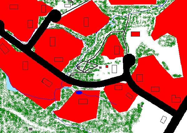blue lines denote water, grey boxes forts, other boxes are buildings,